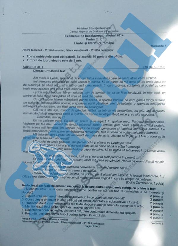 Varianta de subiecte extrasă luni pentru proba scrisă la limba şi literatura română de la examenul de bacalaureat, sesiunea august - septembrie, la profilul real şi filiera tehnologică, a fost cea cu numărul 5.