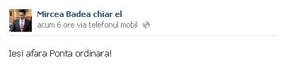 Totodată, Mircea Badea i-a mai transmis un mesaj pe Facebook lui Victor Ponta. "Ieşi afară, Ponta ordinară!", a scris Badea, miercuri, pe reţeaua de socializare.