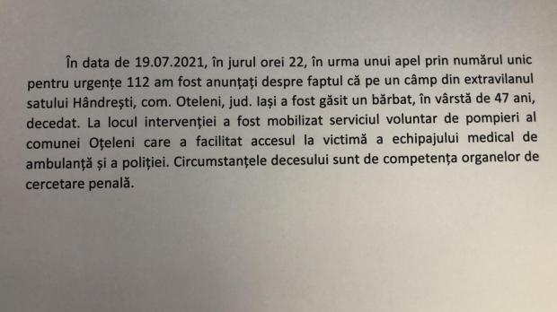 Bărbatul plecase cu vaca la pășune şi, după ceva timp, animalul s-a întors acasă singur. După circa două ore, fiica bărbatului a plecat după el şi l-a găsit pe câmp, fără suflare.