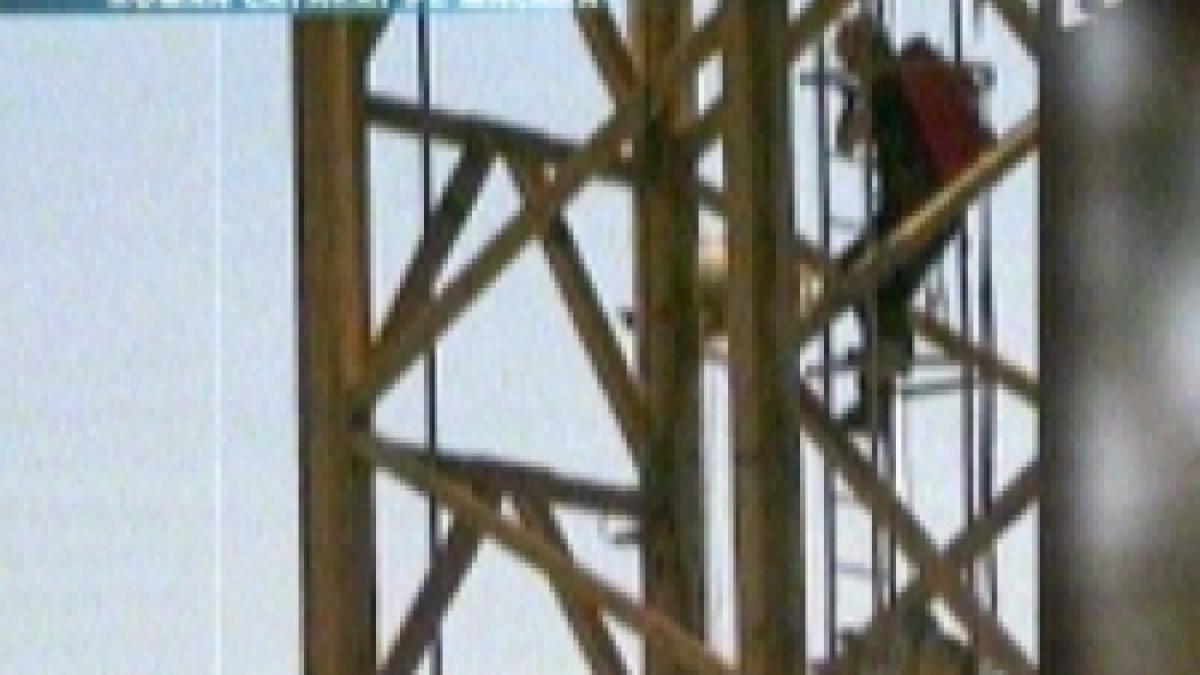 UPDATE 18:10- Bărbatul a fost convins să coboare de pe macara, el fiind preluat de poliţişti.