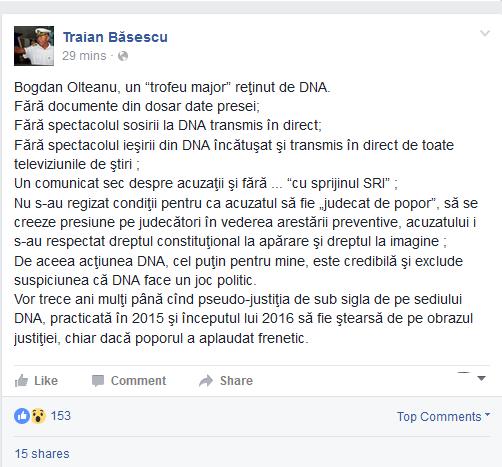 Traian Băsescu comentează, vineri, într-o postare pe Facebook, modul în care a acționat DNA în cazul reținerii viceguvernatorului BNR Bogdan Olteanu.