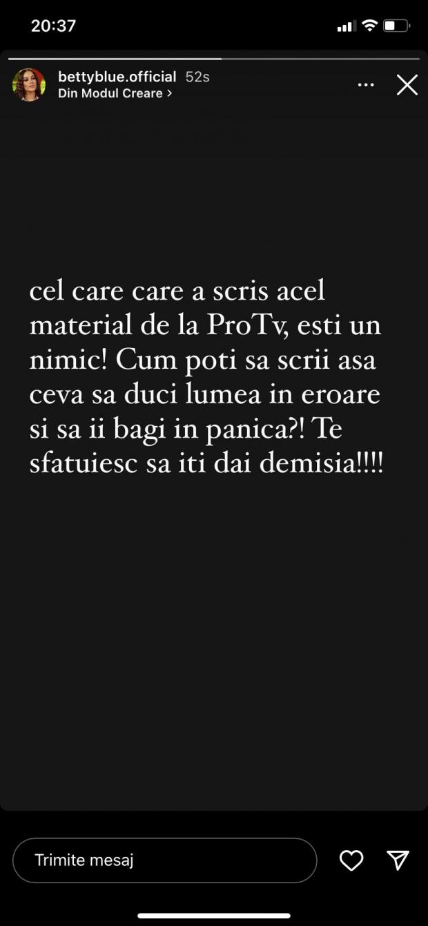 "Cel care a scris acel material de la ProTv eşti un nimic. Cum poţi să scrii şi să duci lumea în eroare şi să îi bagi în panică? Te sfătuiesc să îţi dai demisia", a transmis Betty Salam, fiica lui Florin Salam pe reţelele sociale.