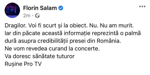 "Dragilor voi fi scurt şi la obiect. Nu. Nu am murit. Iar din păcate accesată informație reprezintă o palmă dură asupra credibilității presei din România. Ne vom revedea curând la concerte. Vă soresc sănătate tuturor. Ruşine ProTV", a transmis Florin Salam pe pagina sa de Facebook.