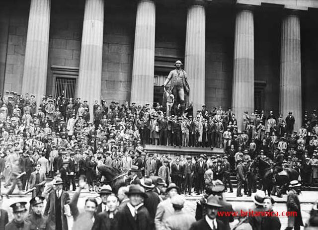 Pe 29 octombrie 1929, New York Stock Exchange s-a prăbuşit. Preţurile au scăzut vertiginos întrucât prea multe persoane au încercat să-şi vândă acţiunile în acelaşi timp. Milioane de investitori şi-au pierdut economiile. Şi mai mulţi s-au trezit înglodaţi în datorii, pentru că nu au putut înapoia banii împrumutaţi.