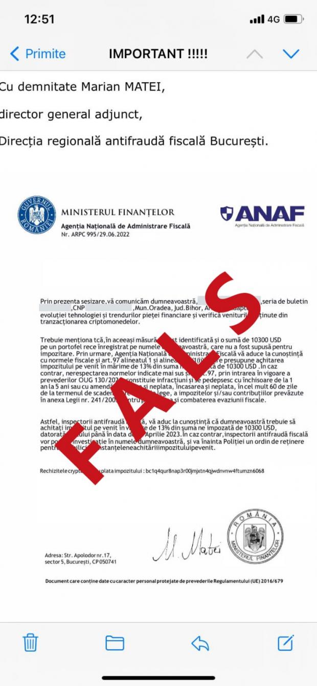 Solicitarea frauduloasă a fost transmisă de pe o adresă de email care nu aparține instituției, iar documentul conține greșeli gramaticale precum și o serie de elemente, nespecifice comunicărilor ANAF.