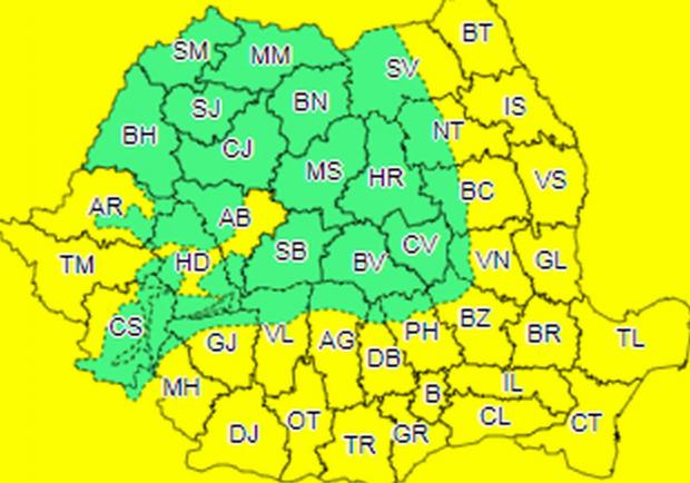 Județele vizate de codul galben sunt Satu Mare, Sălaj, Bihor, Arad, Timiș, Caraș Severin, Cluj, Mureș, Alba, Hunedoara, Sibiu, Mehedinți, Gorj, Vâlcea, Dolj, Olt, Argeș, Teleorman, Giurgiu, Dâmbovița, Prahova, Buzău, Ialomița, Călărași, Constanța, Tulcea, Brăila, Galați, Vrancea, Vaslui, Bacău, Iași, Neamț, Botoșani, Suceava și Capitala.