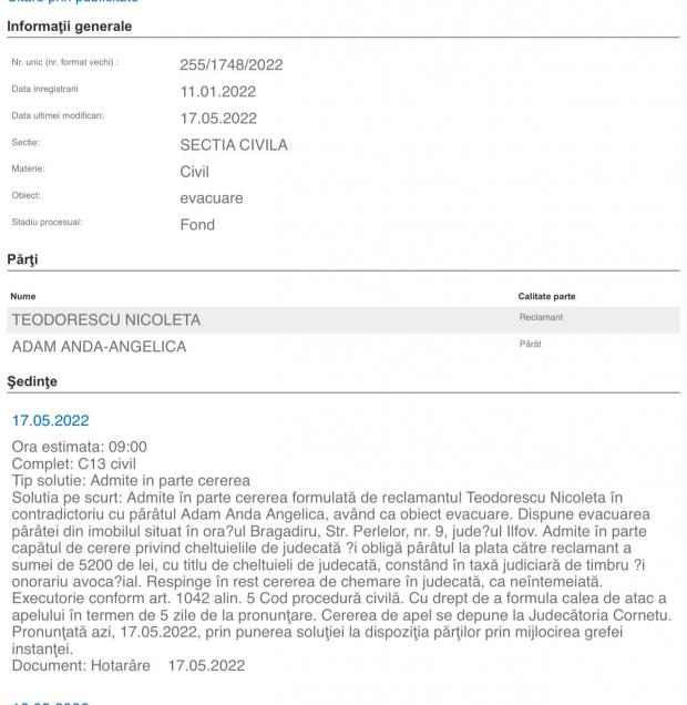 Potrivit hotărârii judecătorești, decizia nu este definitivă și poate fi atacată prin apel în termen de cinci zile, dar este executorie, astfel că artista a fost obligată să plece din imobil.