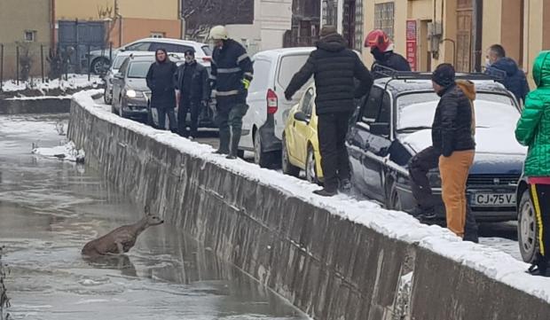 Totul s-a întâmplat, astăzi, pe o stradă din oraşul Câmpeni din Alba, acolo unde mai mulţi oameni au descoperit o căprioară căzută într-un canal cu apă îngheţată.