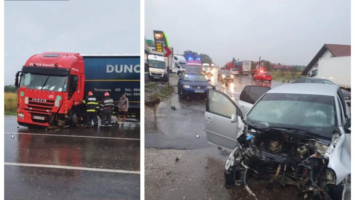 O mașină a lovit un TIR, iar motorul ei a fost proiectat într-un alt autovehicul, care a ricoșat apoi într-un autoturism parcat
