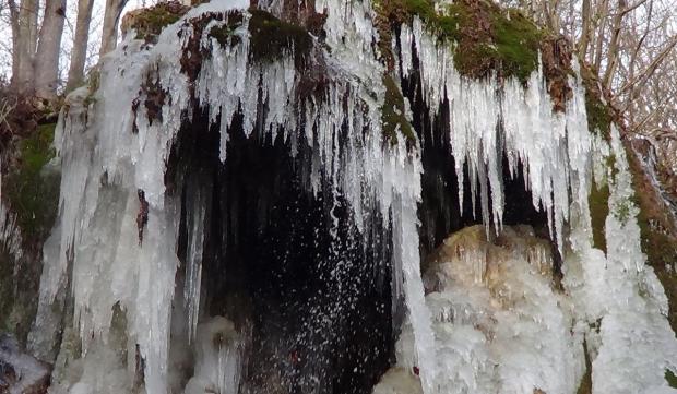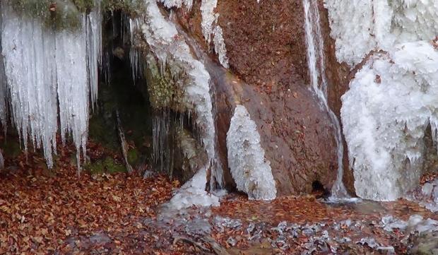 Scurgerea apelor a fost oprită şi încleştată de frigul şi gerul din ultima perioadă. Pe zeci de metri, scurgerile de apă s-au transformat în perdele de gheaţă.