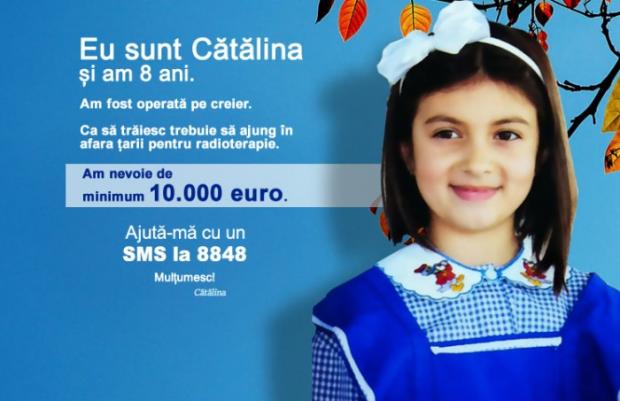 Cel mai aproape de noi este o clinica specializata din Istanbul unde ea trebuie sa ajunga de urgenta. Ca sa traiasca si ca sa isi recapete copilaria, Catalina are nevoie de bani. Peste 10.000 de euro. O suma enorma pentru parintii ei. O putem ajuta sa invinga durerea si suferinta, o putem ajuta impreuna sa zambeasca din nou si sa mearga la scoala. 8848, AICI PUTETI DA UN SMS PENTRU SANSA EI LA VIATA.