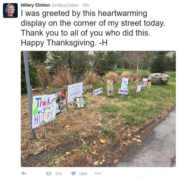Hillary Clinton le-a mulțumit susținătorilor anonimi și le-a urat o zi a Recunoștinței fericită.