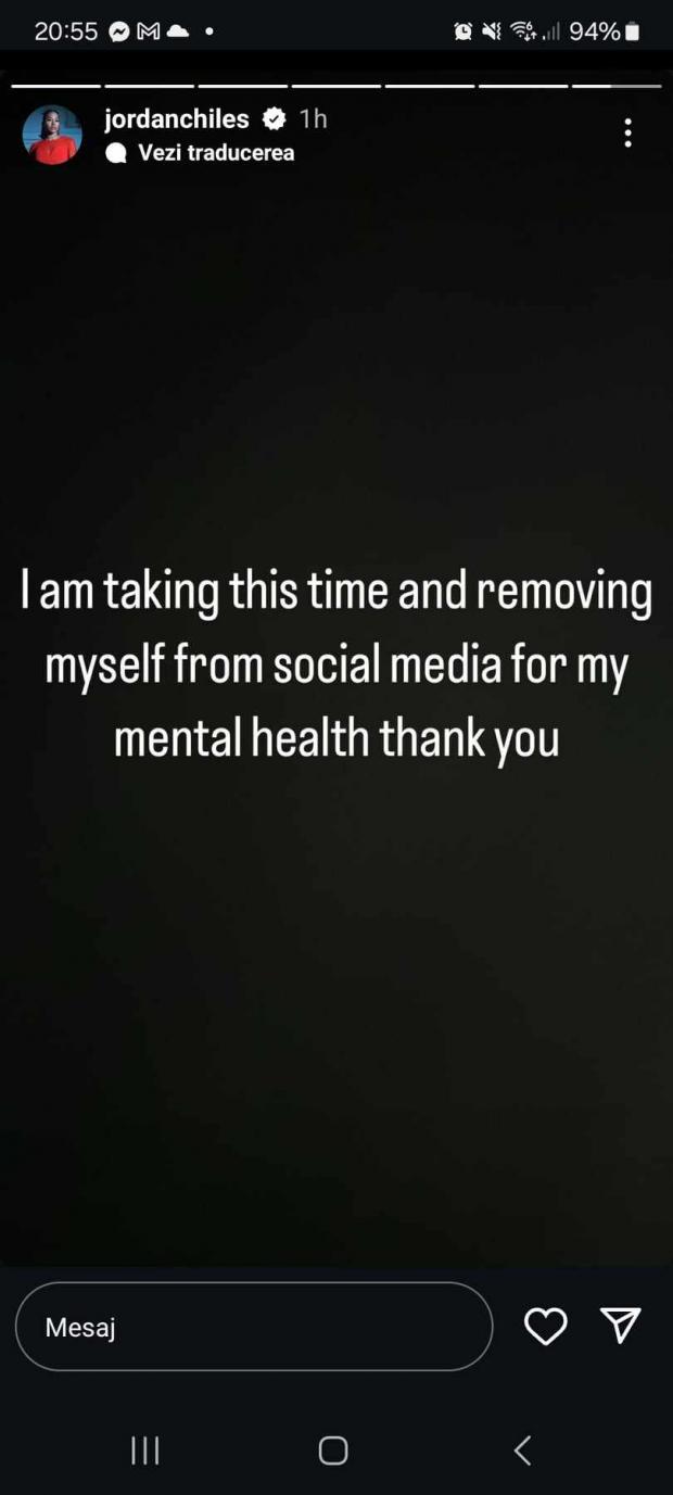 „Acum voi lua o pauză de pe rețelele de socializare pentru sănătatea mea mintală. Mulțumesc", a transmis gimnasta Jordan Chiles pe reţelele sociale.