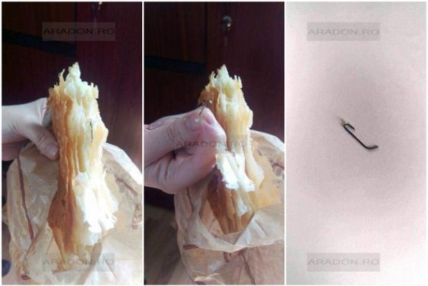 Clienta, în vârstă de 42 de ani, lucrează la o instituție publică și a ieșit în pauza de prânz, luni, pentru a-și cumpăra o gustare. S-a oprit la o patiserie cunoscută, de unde a cumpărat o merdedea. În timp ce mânca, în foietaj a descoperit un obiect metalic, scrie aradon.ro.