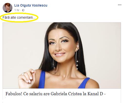 Informațiile legate de salariul prezentatoarei TV au ajuns și la urechile ministrului muncii, Lia Olguța Vasilescu, care a avut o reacție pe Facebook.