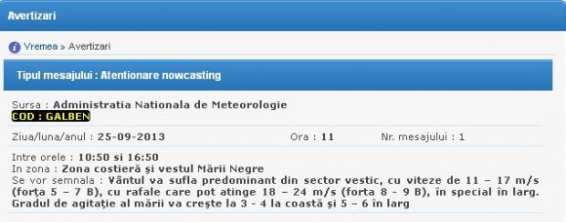 Meteorologii au emis o avertizare cod galben de vânt pentru zona litoralului. Gradul de agitaţie al mării va creşte la 3 - 4 la coastă şi 5 – 6 în larg.