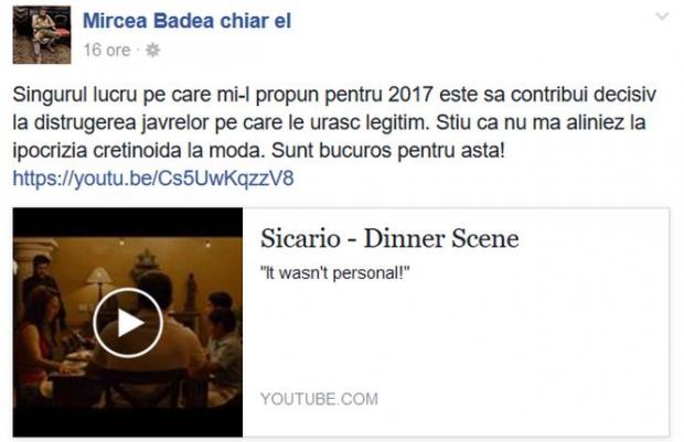 „Singurul lucru pe care mi-l propun pentru 2017 este să contribui decisiv la distrugerea javrelor pe care le urăsc legitim. Știu că nu mă aliniez la ipocrizia cretinoidă la modă. Sunt bucuros pentru asta!”, a scris Mircea Badea pe pagina sa de Facebook.