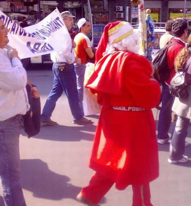 Vedeta mitingului - Moş Crăciun. A sărăcit şi el. Cadourile din ajun nu mai sunt la fel de consistente, aşa că moşneagul e în grevă. Poate se înduplecă Tăriceanu să îi deconteze deplasările.