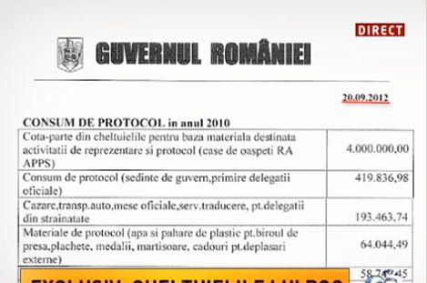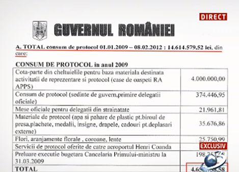 Documentele primite de la Guvernul României arată că, în 2009, fostul prim-ministru Emil Boc a avut cheltuieli de protocol de 4,6 milioane lei. Din această sumă, cea mai mare parte, de 4.000.000 a reprezentat cota-parte din cheltuielile pentru baza materială destinată activităţii de reprezentare şi protocol. Restul banilor au fost alocaţi pentru şedinţe de guvern, mese oficiale, flori.