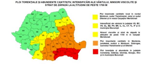 Astfel, de marți seară ora 21:00 până miercuri la ora 15.00, vor fi ploi torențiale și abundente în județele Constanța, Călărași, Ialomița, Giurgiu, Ilfov și în municipiul București.