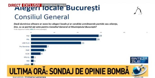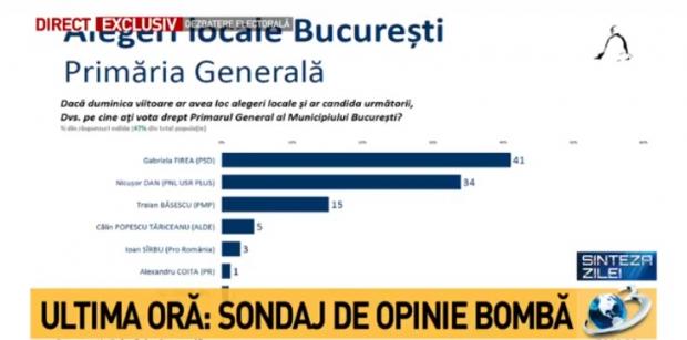 Principalul său contracandidat, Nicușor Dan, ar primi doar 34%, în timp ce Traian Băsescu s-ar clasa pe locul 3 cu 15% dintre voturile bucureștenilor.