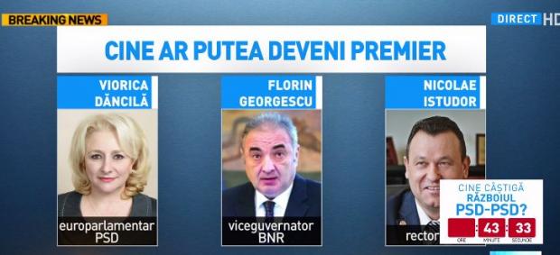 Există informații că ar putea să fie cineva din afara PSD, de aceea Florin Georgescu și Nicolae Istudor sunt mai bine clasați în acest moment, pentru că un dialog secret cu Administrația Prezidențială ar converge spre această variantă. Nu va fi un premier membru de partid. Extrem de dificil pentru Liviu Dragnea să explice o astfel de variantă pentru colegii săi.