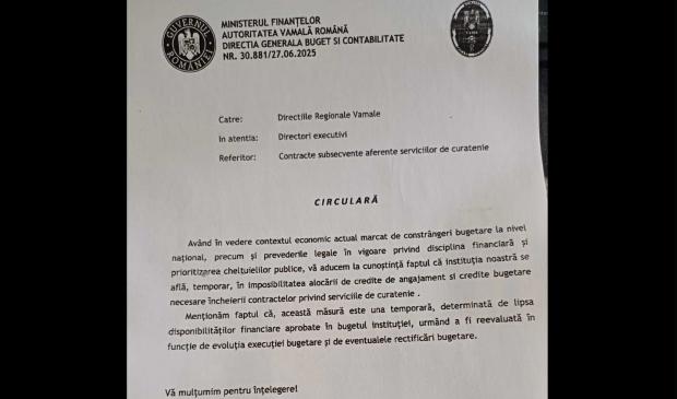 Ministerul Finanțelor a transmis două circulare către Direcțiile Regionale Vamale prin care îi informează pe șefii vămilor din toată țara că nu mai există bani pentru servicii de curățenie și nici pentru servicii de pază, și că, începând cu luna august, angajații vor fi obligați să asigure paza în vămi, în locul firmelor specializate.
