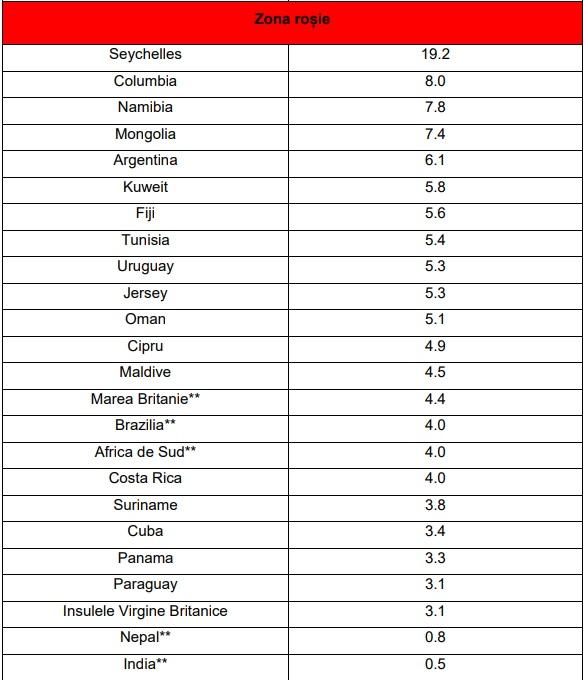 Cele 24 de țări au fost introduse pe lista roșie din cauza numărului mare de persoane infectate la mia de locuitori.