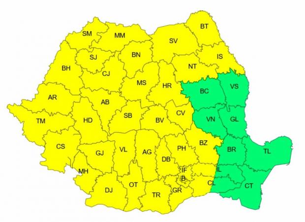 Astăzi este valabil și un cod galben de vreme rea în 16 județe din țară.
