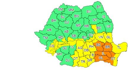 În județele Buzău, Brăila, Ialomița și Călărași, precum și în zona continentală a județului Constanța vor fi perioade cu intensificări ale vântului cu viteze la rafală, în general, de 80...90 km/h, vijelii, averse torențiale, frecvente descărcări electrice și căderi de grindină. În intervale scurte de timp sau prin acumulare, se vor înregistra cantități de apă ce vor depăși 40 l/mp și izolat 50...60 l/mp.