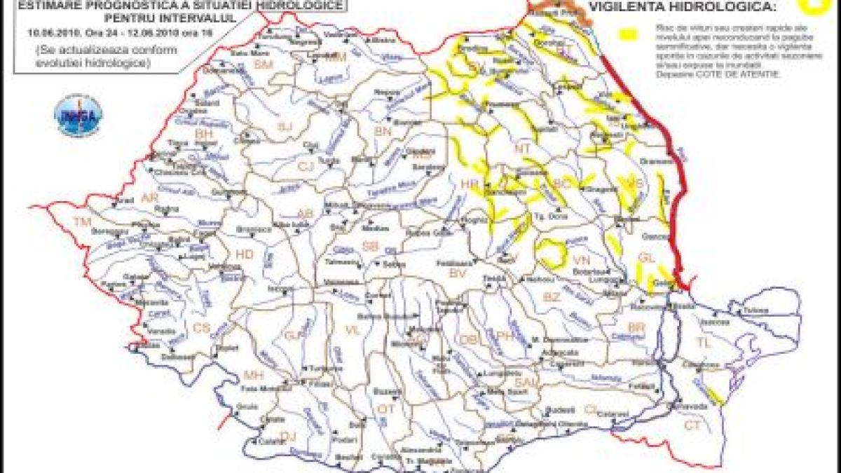 Institutul Naţional de Hidrologie şi Gospodărire a Apelor anunţă că se instituie Cod galben pe afluenţii râurilor: Suceava (Brodina, Suceviţa, Soloneţ, Pozen, Somuz), Moldova (Moldoviţa, Suha, Humor, Pluton), Bistriţa-amonte acumularea Izvorul Muntelui (Bistricioara, Bicaz, Tarcău, Neagra, Cracău), Trotuş (Asău, Tazlău, Uz, Casin, Oituz), Răcătau, Barnat, Putna superioară, Başeu, Jijia (Buhai, Sitna, Miletin, Bahlui, Nicolina), Bârlad (Sacovăţ, Racova, Vaslui, Simila, Tutova, Berheci, Zeletin, Tecucel, Suhu, Geru, Elan, Chineja), Mureş superior, Olt superior (Mădăraş, Turia, Boroşneu, Covasna), pe raza judeţelor Suceava, Neamţ, Bacău, Vrancea, Botoşani, Iaşi, Vaslui, Galaţi, Harghita şi Covasna.