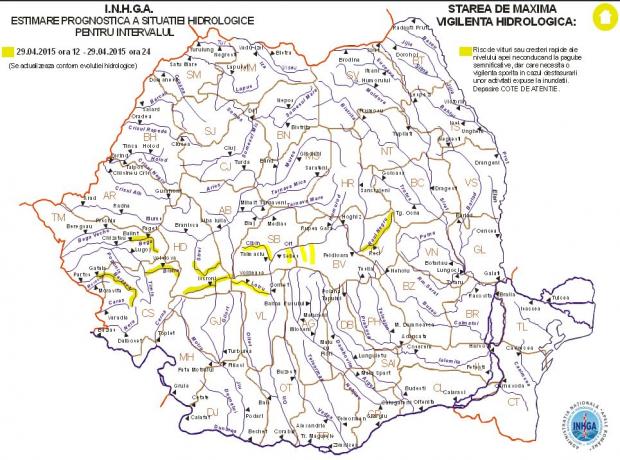 cod galben de inundaţii, valabil în intervalul 29 aprilie ora 12.00 - 29 aprilie ora 24.00, pentru râurile din bazinele hidrografice: Strei şi unii afluenţi mici ai Mureşului din judeţul Hunedoara, Bega – bazin superior, Bistra (afluent Timiş), Bârzava – bazin superior şi mijlociu (judeţele Timiş şi Caraş-Severin), Jiu superior – judeţul Hunedoara, Cibin, Lotru, Râul Negru şi unii afluenţi mici ai Oltului mijlociu şi inferior din judeţele Covasna, Braşov, Sibiu, Vâlcea şi Argeş.