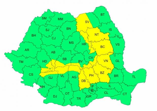 Codul galben e valabil în județele Dâmbovița, Prahova, Buzău, Vrancea, Bacău și Neamț, și doar în unele regiuni din județele Gorj, Vâlcea, Argeș, Hunedoara, Alba, Sibiu, Brașov, Covasna, Harghita și Suceava.