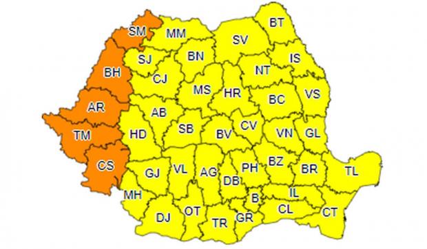 Codul portocaliu este valabil în data de 23 iunie, în zonele Caraș-Severin, Timiș, Arad, Bihor și Satu Mare.