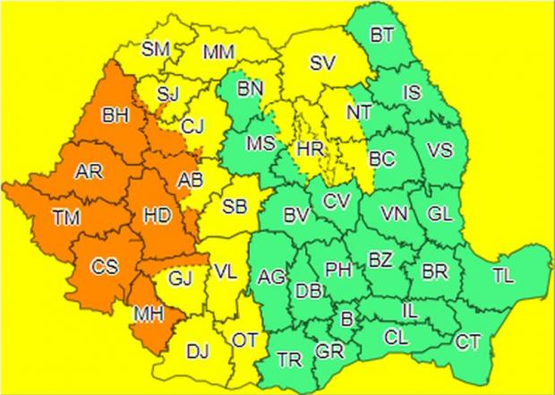 De asemenea, un cod galben valabil marți, între orele 12:00 – 18:00 anunță în Banat, Crișana, Maramureș, local în Transilvania și vestul Moldovei, perioade cu instabilitate atmosferică accentuată ce se vor manifesta prin averse ce vor avea și caracter torențial, descărcări electrice, intensificări de scurtă durată ale vântului, vijelii și grindină.
