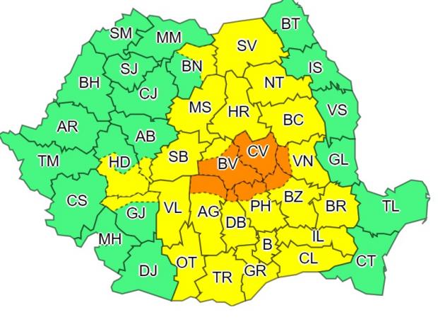 Potrivit meteorologilor, în zona de munte a județelor Brașov, Covasna, Vrancea, Buzău, Prahova, Dâmbovița și Argeș, va ninge abundent, se va depune strat de zăpadă consistent, iar vântul va avea intensificări temporare cu rafale de 55...70 km/h spulberând zăpada și determinând scăderea vizibilității.