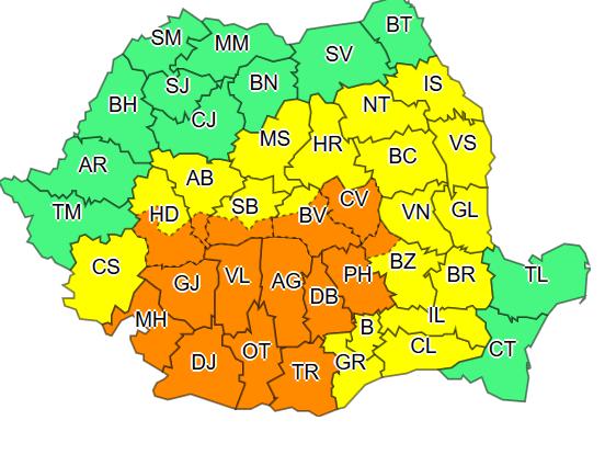 Pe parcursul zilei de luni, în judeţele Gorj, Vâlcea, Mehedinţi, Dolj, Olt, Argeş, Dâmboviţa, Prahova, Teleorman şi zona de munte a judeţelor Hunedoara, Alba, Sibiu, Braşov, Covasna şi Buzãu instabilitatea atmosfericã va fi deosebit de accentuatã şi se va manifesta prin averse torenţiale, frecvente descãrcãri electrice, intensificãri ale vântului cu aspect de vijelie şi cãderi de grindinã. În intervale scurte de timp sau prin cumulare se vor înregistra cantitãţi de apã de 50...70 l/mp şi pe arii restrânse 80...90 l/mp, potrivit Administrației Naționale de Meteorologie.