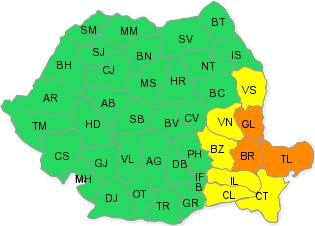 UPDATE: În judeţele Brăila şi Tulcea cantităţile de apă vor depăşi local 50...60 l/mp, iar în judeţul Galaţi mai sunt posibile cantităţi de apă de 30...40 l/mp.