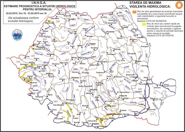 Codul galben se menţine pe cursurile inferioare ale râurilor Crasna (judeţul Satu Mare), Crişul Alb (judeţul Arad), Timiş (judeţul Timiş), Bârzava (judeţul Timiş), Desnatui (judeţul Dolj) şi Vedea (judeţul Teleorman), pe Bega Veche (judeţul Timiş), Moraviţa (judeţul Timiş), pe Jiu în sectiunea Răcari (judeţul Dolj) şi pe unii afluenţi ai Argeşului inferior (Dambovnic, Glavacioc, Sabar, Dâmboviţa) - judeţele Giurgiu, Argeş şi Ilfov.