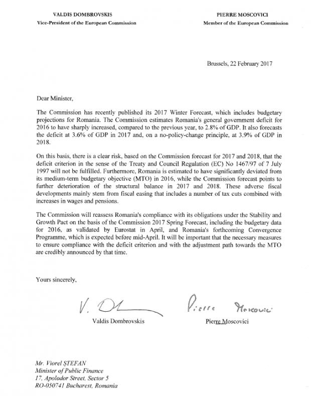 ”Există un risc clar, în baza previziunilor Comisiei referitoare la anii 2017 și 2018, de neîndeplinire a criteriilor de deficit potrivit Tratatului și Reglementărilor Comisiei Nr. 1467/97 din 7 iulie 1997. Suplimentar, estimăm că România va înregistra deviații semificative ale obiectivelor bugetare pe termen mediu (MTO) în 2016, Comisia considerând că balanța structurală va suferi noi deteriorări în 2017 și 2018”, se arată în scrisoarea oficialilor europeni.