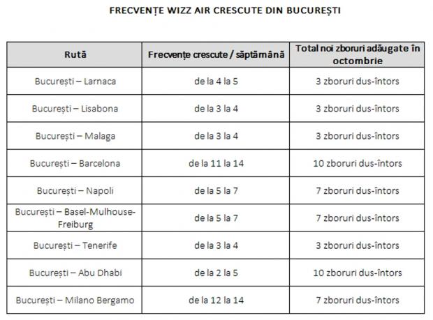 Cele nouă rute suplimentate de Wizz Air sunt Larnaca, Lisabona, Malaga, Barcelona, Napoli, Basel, Tenerife, Abu Dhabi și Milano Bergamo.