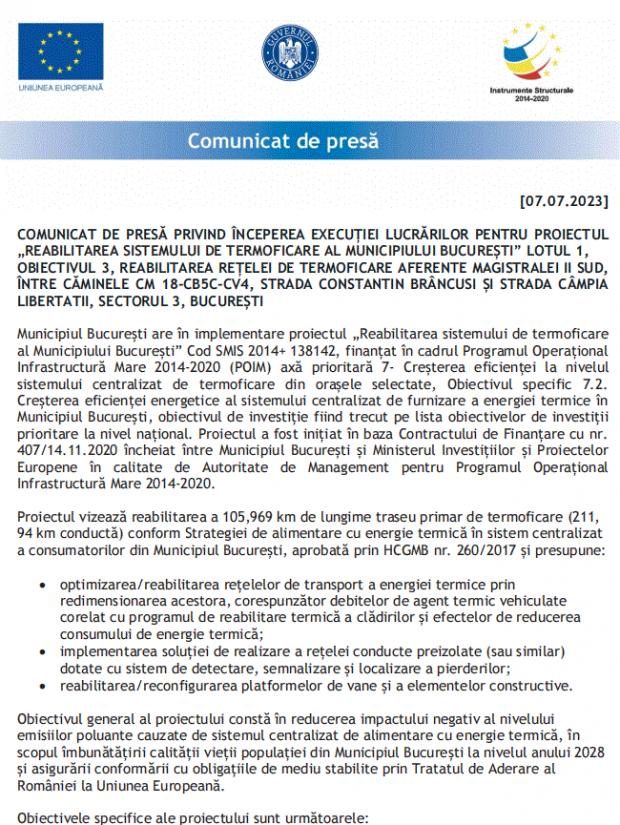 Comunicat de presă privind începerea executării lucrărilor pentru proiectul "Reabilitarea sistemului de termoficare al Municipiului București" lotul 1, obiectivul 3 (P)