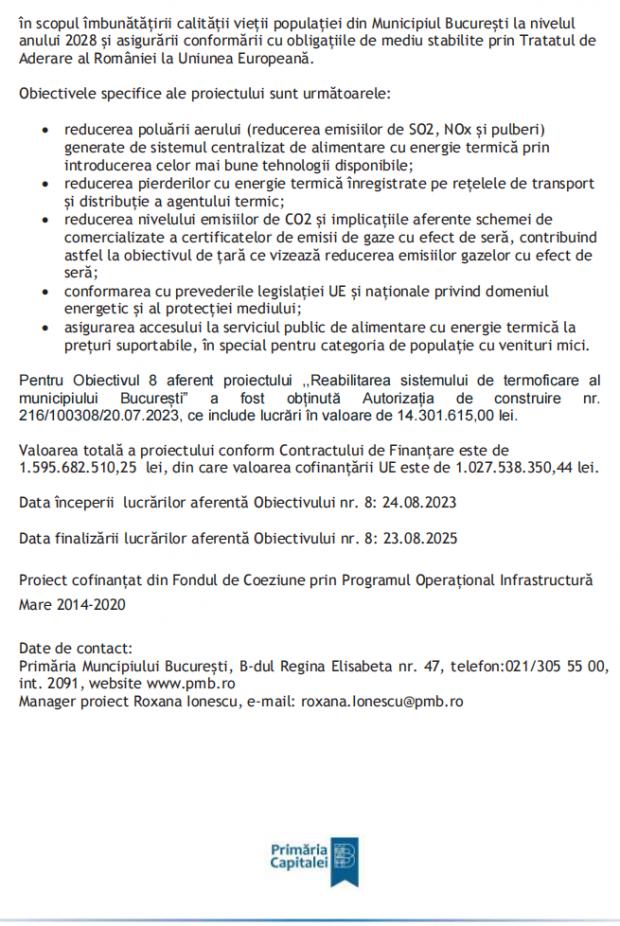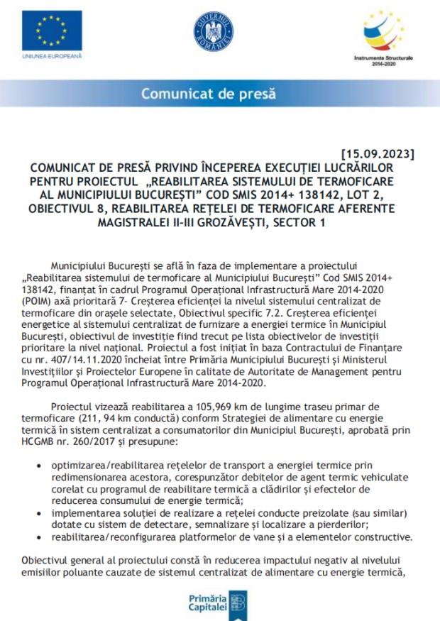 Comunicat de presă privind începerea execuţiei lucrărilor pentru proiectul "Reabilitarea sistemului de termoficare al Municipiului Bucureşti" COD SMIS 2014+ 138142, LOT 2, OBIECTIVUL 8