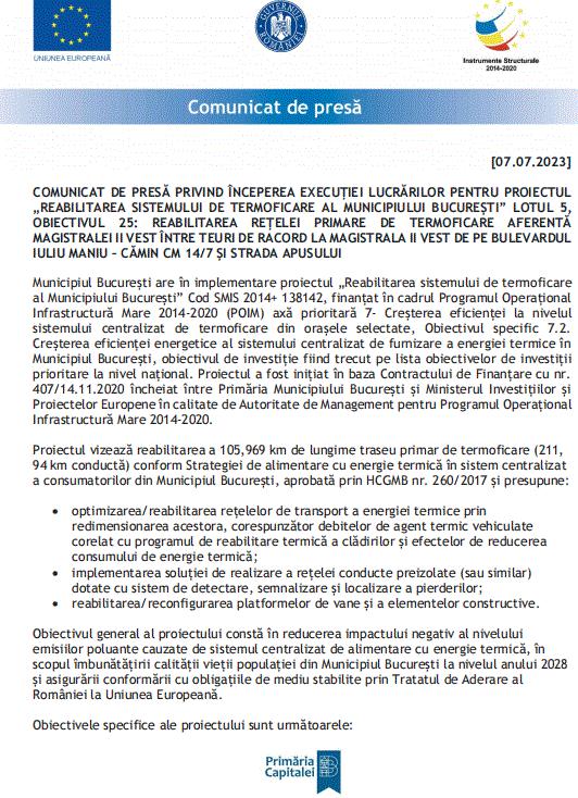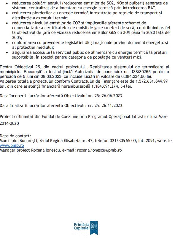 Comunicat de presă privind începerea executării lucrărilor pentru proiectul "Reabilitarea sistemului de termoficare al Municipiului București" lotul 5, obiectivul 25 (P)