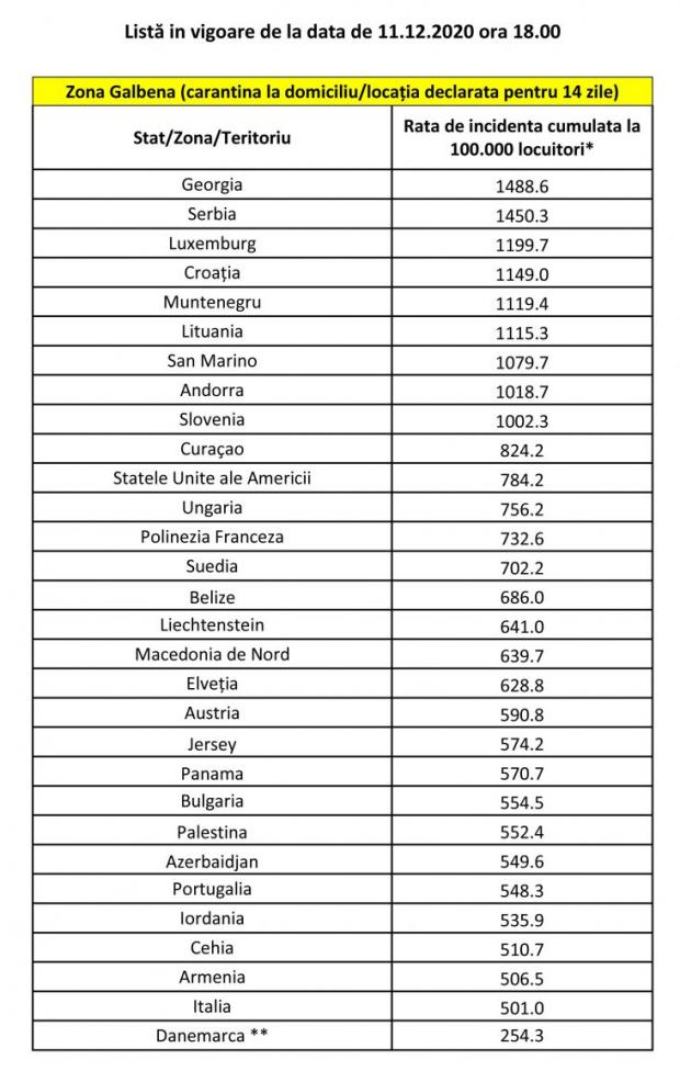 Lista ţărilor din aşa numita zonă galbenă, de risc epidemiologic şi care obligă la carantinare, a fost actualizată prin decizia Comitetului Naţional pentru Situaţii de Urgenţă din 10 decembrie şi poate fi consultată aici.