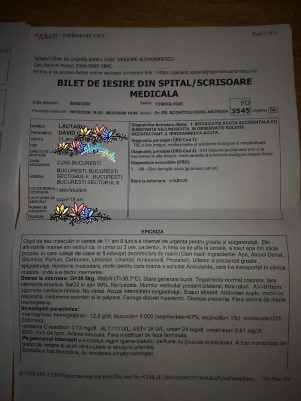 ”I s-a scos sticla cu apă din ghiozdan și i-au turnat dezinfectant peste apă. Apoi i-au pus sticla pe birou, iar când D. s-a întors din pauză a luat o înghițitură mare. După câteva minute, a început să simtă dureri abdominale și arsuri pe piept”, a povestit tatăl băiatului pentru wowbiz.ro.
