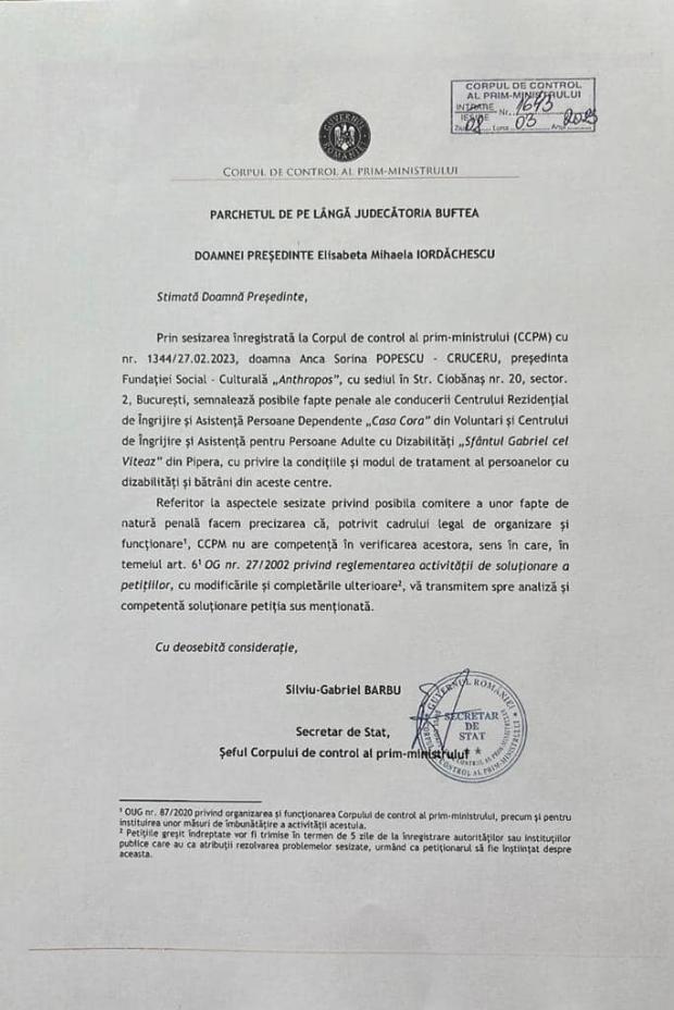 Plângerea fundației, înregistrată la guvern la finele lunii februarie anul curent, a fost însă direcționată cu celeritate spre Parchetul de pe lângă Judecătoria Buftea, după cum reiese din documentul semnat de șeful Corpului de Control (imaginea următoare).