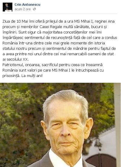 "Ziua de 10 Mai îmi oferă prilejul de a ura MS Mihai I, reginei Ana precum şi membrilor Casei Regale multă sănătate, bucurii şi împliniri. Sunt sigur că majoritatea concetăţenilor mei îmi împărtăşesc sentimentul de recunoştinţă faţă de cel care a condus România într-una dintre cele mai grele momente din istoria statului nostru precum şi sentimentul de mândrie pentru faptul de a avea printre noi unul dintre cei mai remarcabili oameni de stat ai secolului XX. Patriotismul, onoarea, sacrificiul pentru ceea ce înseamnă România sunt valori pe care MS Mihai I le întruchipează cu prisosinţă. La mulţi ani!", subliniază preşedintele Senatului, într-un mesaj postat pe pagina personală de Facebook.