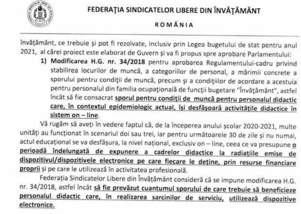 Mai exact, potrivit adresei depuse la Guvern, FSLI solicită modificarea Hotărârii de Guvern 34/2018, astfel încât “să fie consacrat sporul pentru condiții de muncă pentru că personalul didactic care, în contextul epidemiologic actual, își desfășoară activitățile didactice în sistem online”.