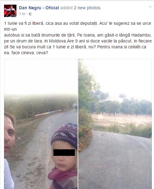 ''1 Iunie va fi zi liberă, cică așa au votat deputații. Acu' le sugerez să se urce într-un autobus și să bată drumurile țării. Pe Ioana, am găsit-o lângă Hadambu, pe un drum de țară, în Moldova. Are 9 ani și duce vacile la păscut, în fiecare zi! Se va bucura mult că 1 Iunie e zi liberă, nu? Pentru Ioana și ceilalți ca ea, face cineva, ceva?'', a scris Dan Negru.